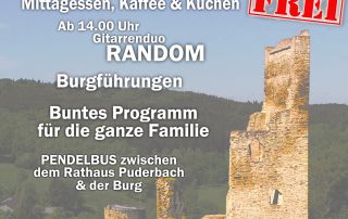 Am Sonntag, 21.06.2026 steht das Gelände ganz im Zeichen des 25-jährigen Jubiläums. Die Besucher erwartet ein Buntes Programm für die ganze Familie. Burgführungen, Aktionen für Kinder, Feierstunde zum Jubiläum unter Mitwirkung der örtlichen Kindergärten. Ab 14 Uhr musikalische Unterhaltung mit dem Guitarrenduo Random. Für das leibliche Wohl mit Mittagessen, Kaffee und Kuchen, kalten Getränken und Snacks ist bestens gesorgt. Weiter gibt es Informationen über die Arbeit des Fördervereins der letzten 25 Jahren zum Erhalt des Wahrzeichens des Puderbacher Landes. Aufgrund der begrenzten Parkplätze fährt ab 11.45 Uhr ein kostenloser Pendelbus zwischen dem Burggelände und dem Buswendeplatzes am Rathaus[...]