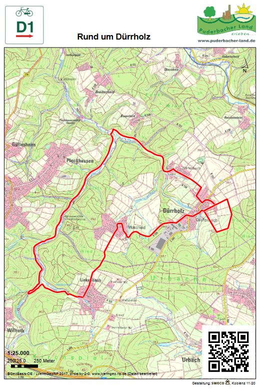 Der Rundweg [D1] verbindet die Ortsteile Daufenbach, Muscheid und Werlenbach sowie die Nachbargemeinde Linkenbach miteinander. Der Weg führt durch zwei wunderschöne benachbarte Täler. Die richtungsabhängige Ausschilderung des Rundwegs (Hauptrichtung, gekennzeichnet durch rote Pfeile) soll gewährleisten, dass die Höhenunterschiede durch eher sanfte aber stetige Steigungen bewältigt werden und kurze etwas steilere Passagen den Gefällstrecken vorbehalten bleiben. Eine von vielen Einstiegsmöglichkeiten in die Stre-cke bietet das Dorfgemeinschaftshaus im Ortsteil Daufenbach, das gleichzeitig auch Einstiegspunkt für den sehenswerten Naturerlebnispfad ist. Zur Optimierung der Steigungsverhältnisse ist der Weg in Form einer Acht ausgestaltet. Aus diesem Grund ist der Weg nach dem Schnittpunkt in Daufenbach vorübergehend mit der Bezeichnung [D1a] ausgeschildert. In der Gemarkung Werlenbach geht es dann in das idyllische Daufenbachtal, welches in das ebenfalls fernab vom Straßenverkehr verlaufende Grenzbachtal mündet. Ein moderater Anstieg in dem landschaftlich anspruchsvollen Tal führt dann zur Nachbargemeinde Linkenbach. Von dort führt der Weg wieder mit tollen Fernsichten über den Ortsteil Muscheid zum Ausgangspunkt zurück.